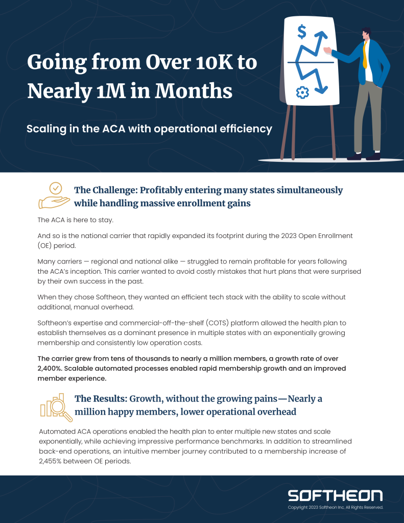 Softheon connects enrollment, billing, and payments across ACA, ICHRA, Dental, Vision, and Medicare Advantage to improve effectuation and reduce churn. Members get a seamless way to enroll and pay, while plans gain real-time visibility and smarter operations. The result: Faster cash flow, fewer delinquencies, and stronger retention.