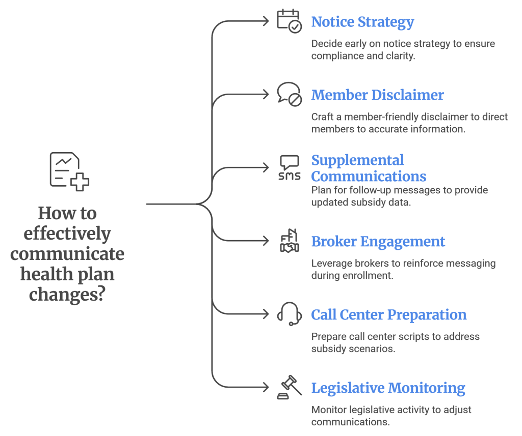 - Health plans should prioritize proactive member education and outreach to prepare members for potential changes, including crafting plain-language disclaimers, planning supplemental communications, and leveraging broker and partner channels.