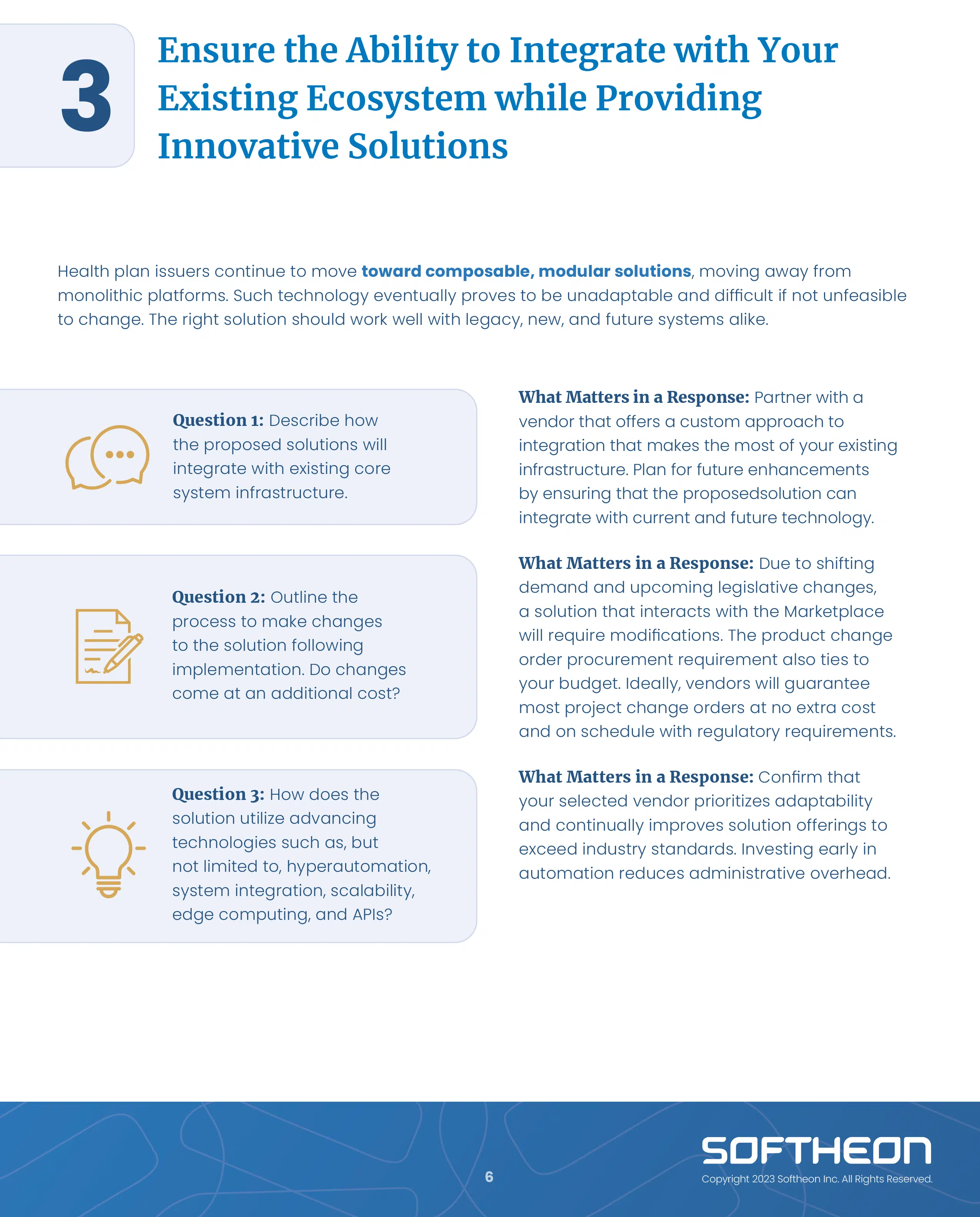 In this guide, Softheon poses relevant questions that health plans must ask during the procurement process to secure robust and scalable billing and enrollment solutions. This guide serves as your outline, complete with key areas to focus on, questions you should ask, and what to look for in a response.